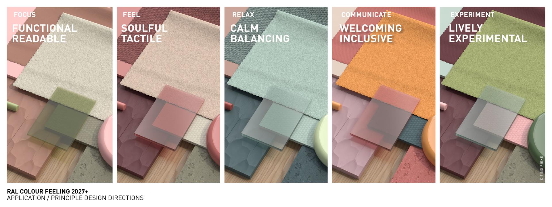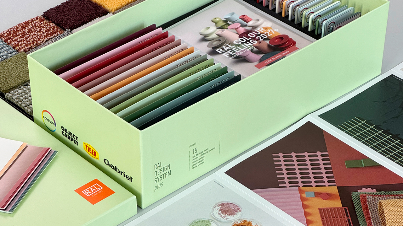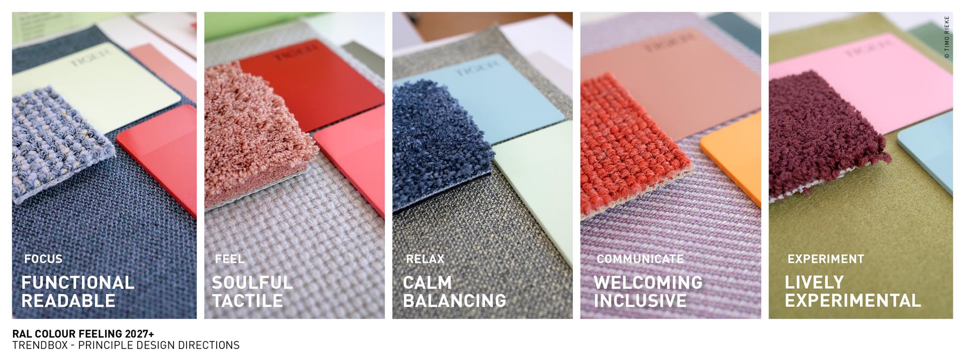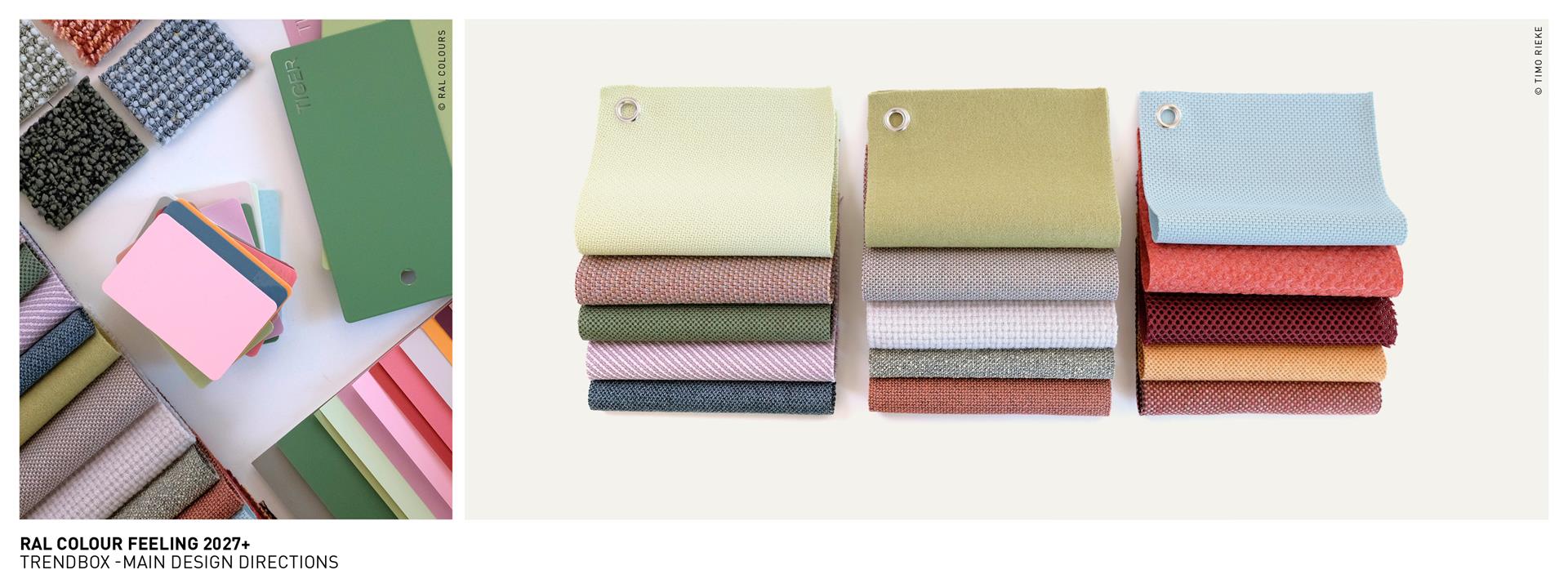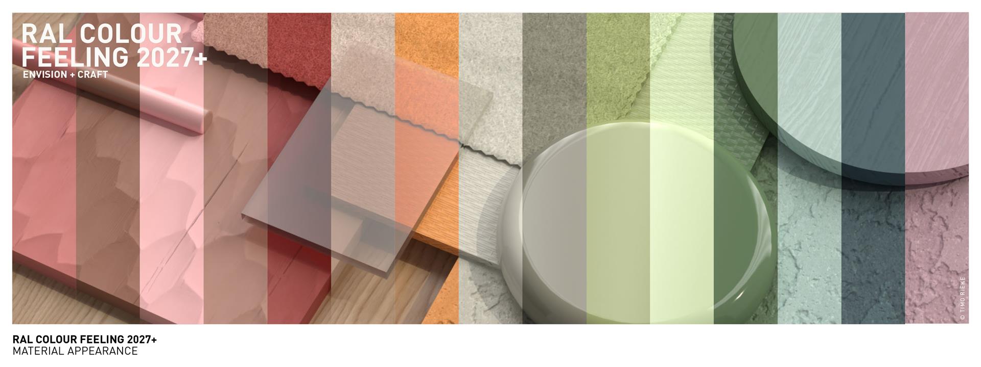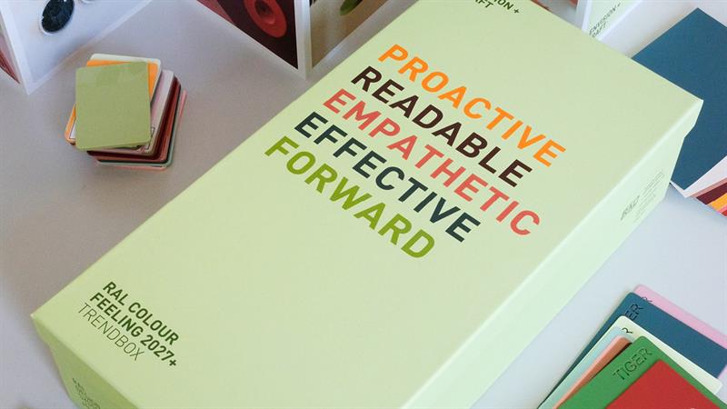 Die RAL Trendbox übersetzt die 15 Farben des Farbtrendreports RAL COLOUR FEELING 2027+ in verschiedene Materialien und Oberflächen.