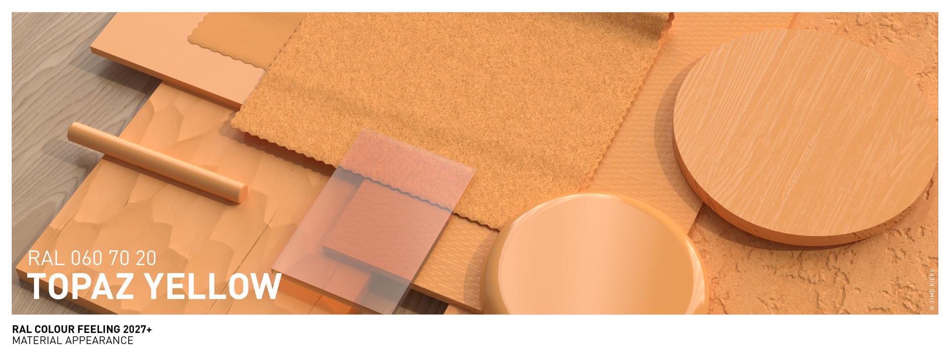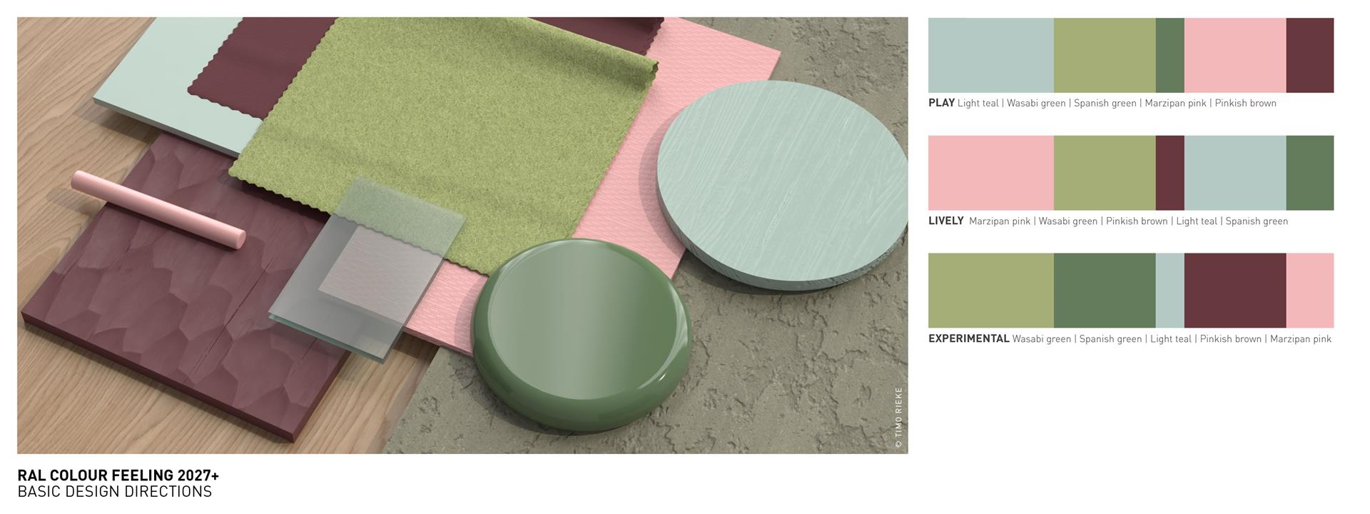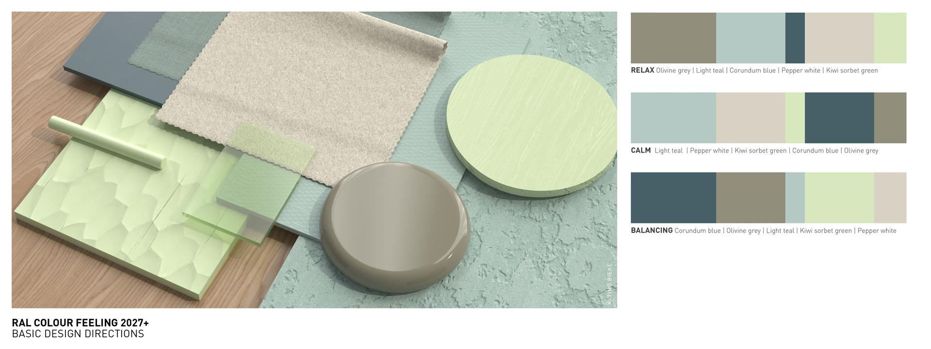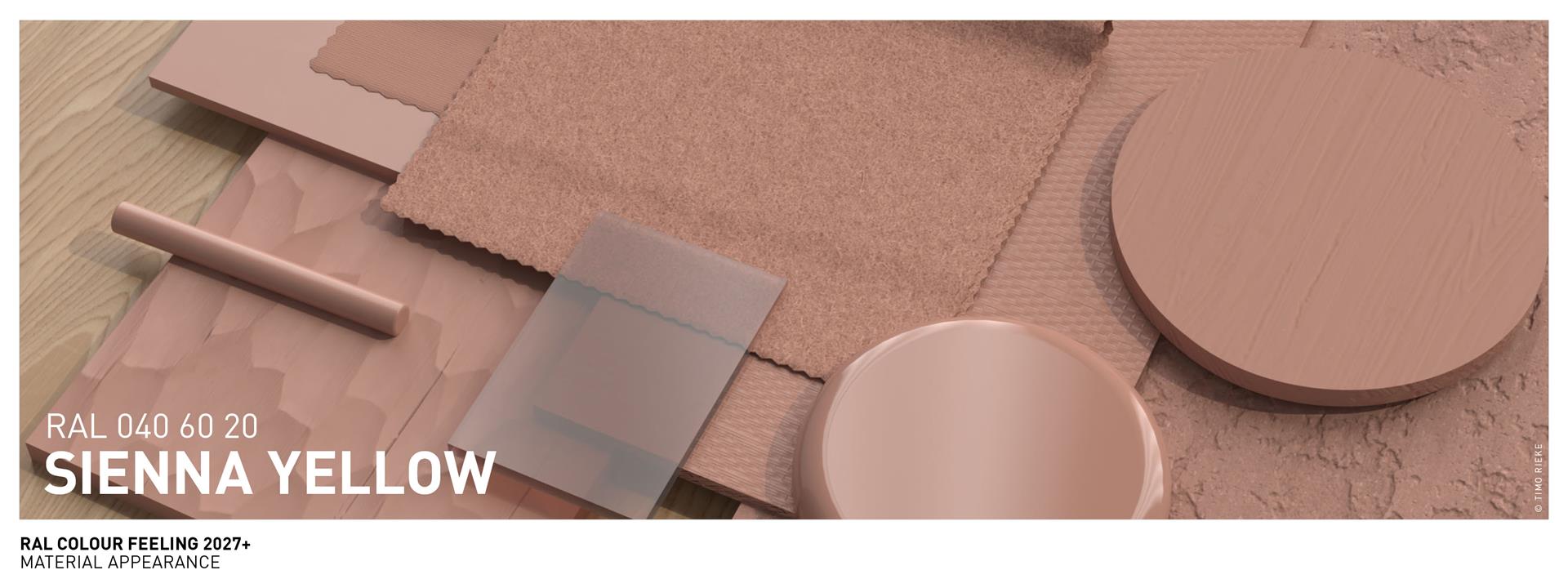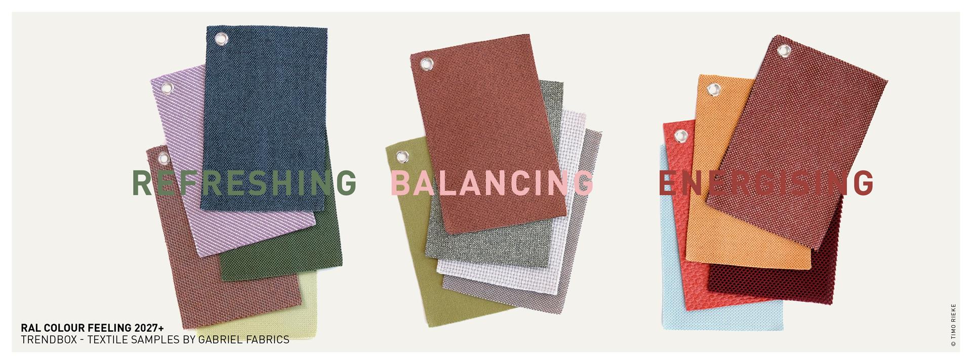 Die RAL Trendbox übersetzt die 15 Farben des Farbtrendreports RAL COLOUR FEELING 2027+ in verschiedene Materialien und Oberflächen.