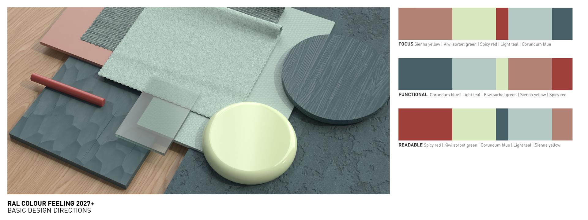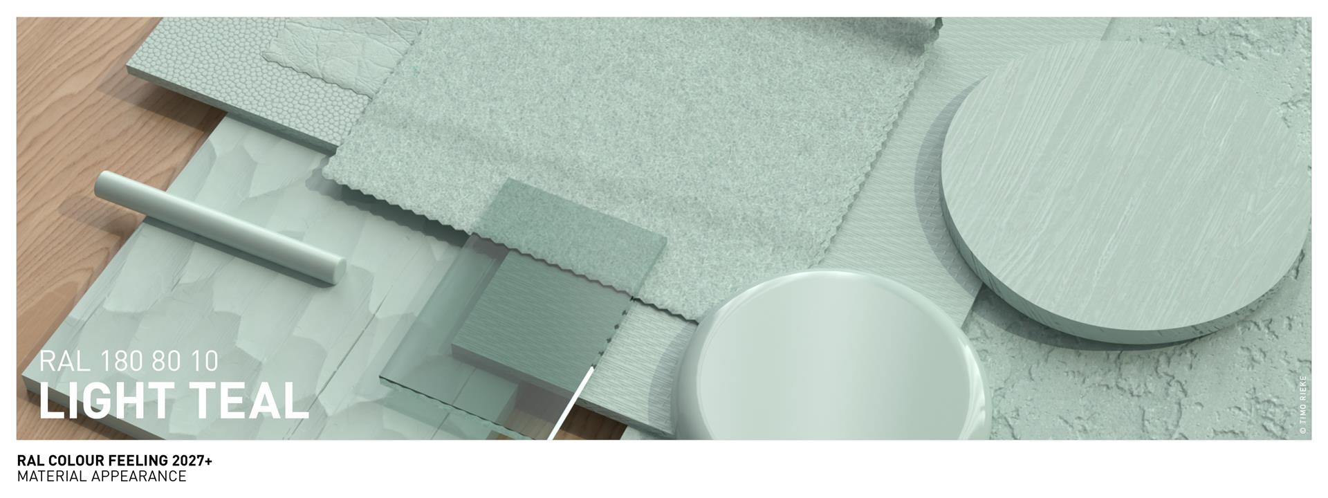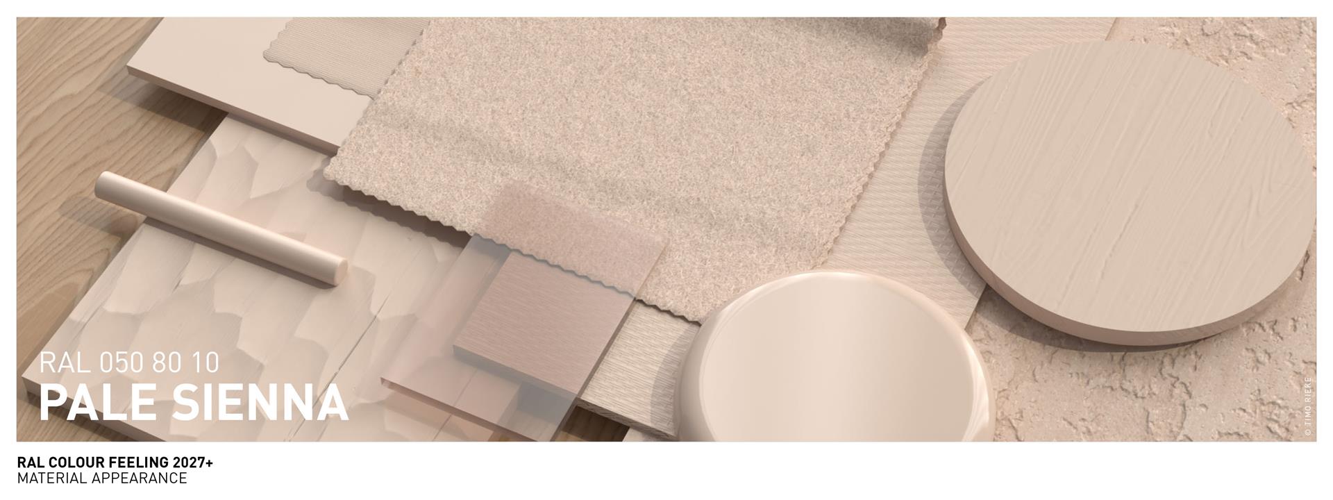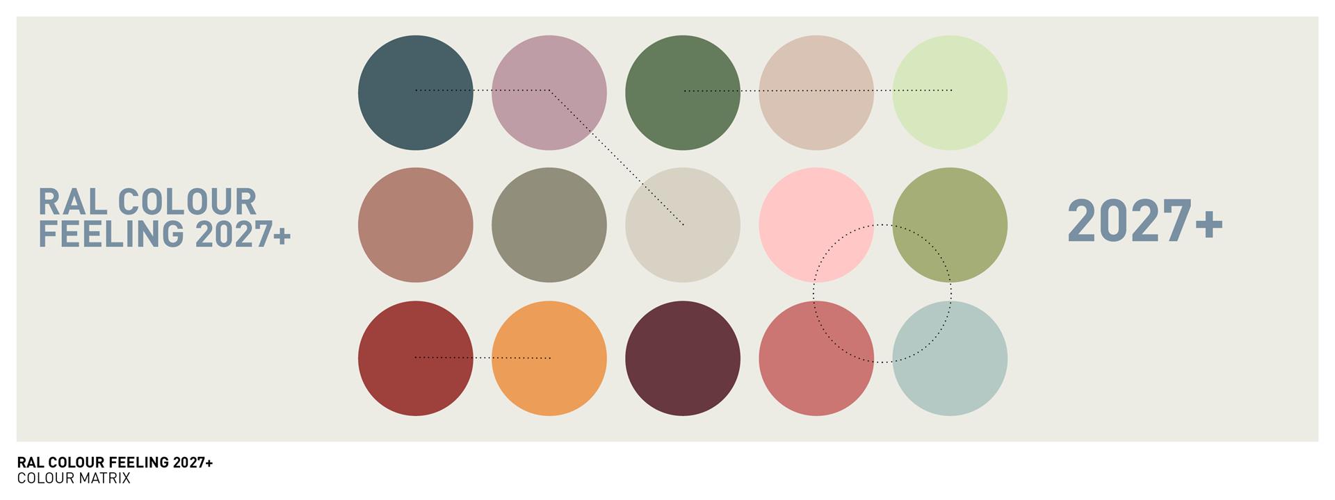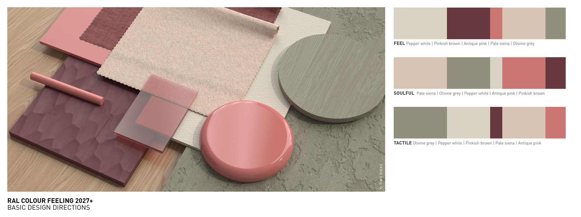 Die RAL Trendbox übersetzt die 15 Farben des Farbtrendreports RAL COLOUR FEELING 2027+ in verschiedene Materialien und Oberflächen.