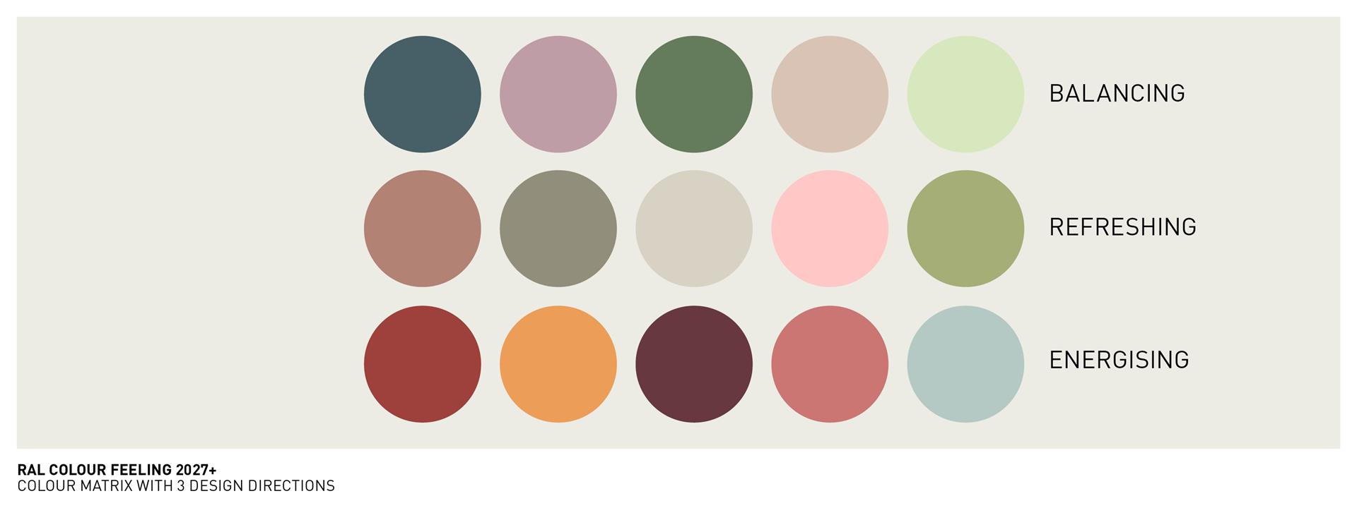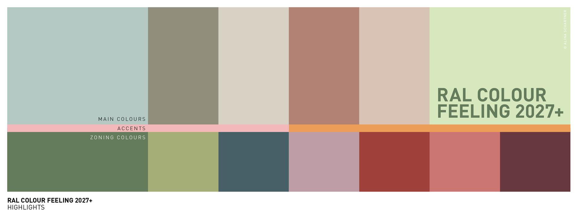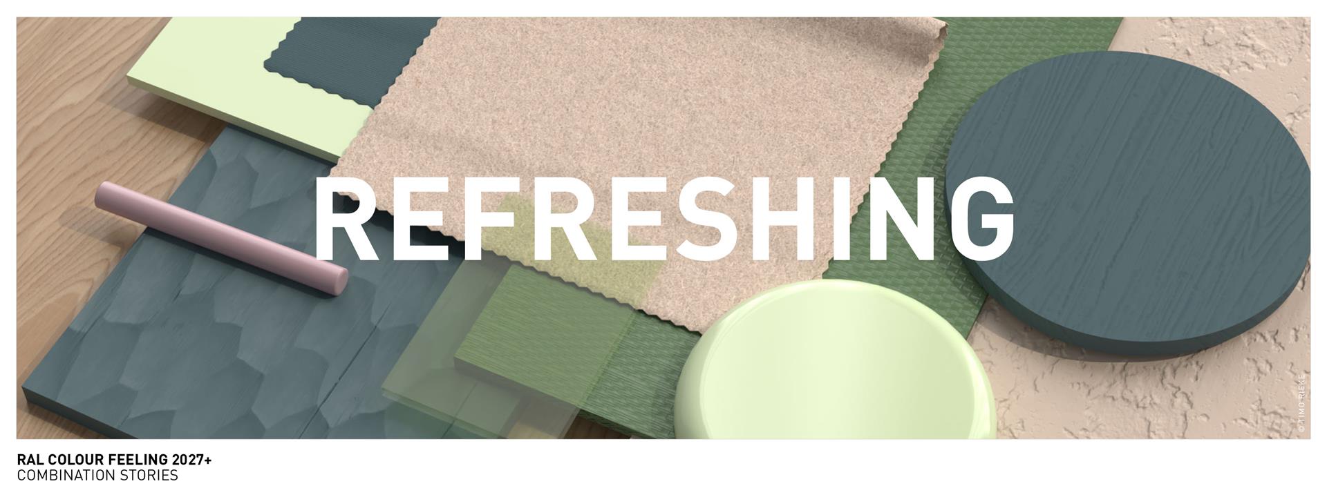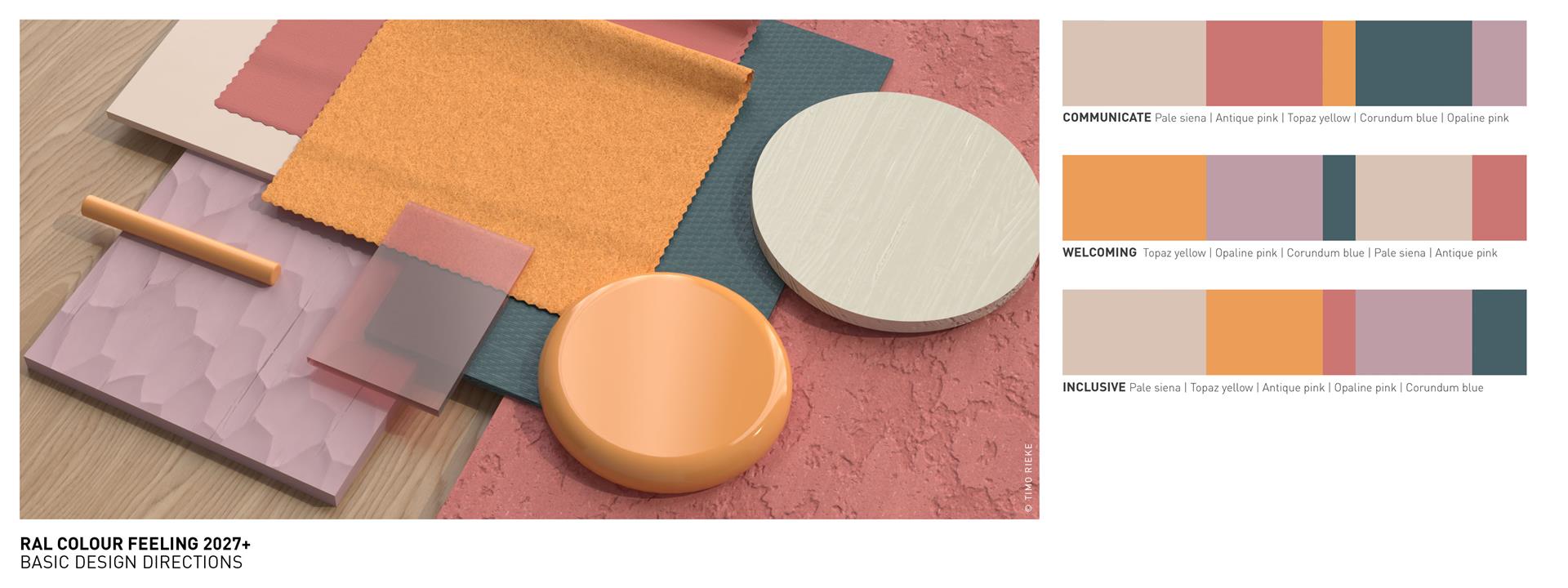 Die RAL Trendbox übersetzt die 15 Farben des Farbtrendreports RAL COLOUR FEELING 2027+ in verschiedene Materialien und Oberflächen.